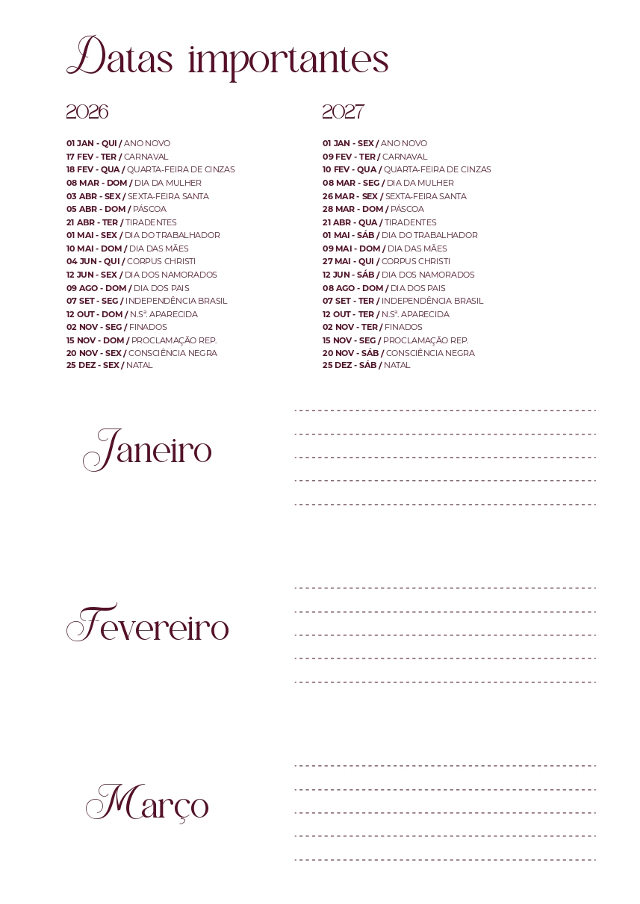 Embora não seja datado, o planner contém os calendários de 2026 e 2027 para que você consiga preencher as datas com facilidade, sem ficar engessada em um formato.
